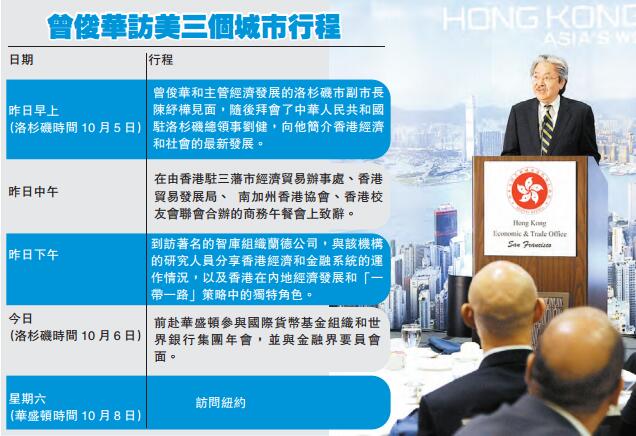 曾俊华於洛杉矶时间10月6日转往华盛顿参加国际货币基金组织和世界银行集团年会,并与金融界要员会面。他会在当地逗留至星期六(华盛顿时间10月8日),然后访问纽约。