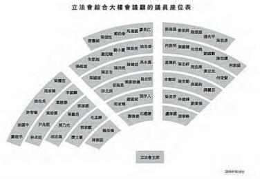 另外,立法会秘书处也公布了新一届议员的座位表,相关座位分布与上届议会没太大分别。举行大会的会议厅方面,民建联、工联会、经民联的议员,位置依然接近立法会主席的右方;身为立法会主席候选人之一的梁君彦,则获安排坐在上届主席曾钰成的原座位,即是在右方最后的位置;新民党议员、自由党议员,以及独立议员谢伟俊,则如以往一样坐在中央的前3行;他们的后方则有保险界陈健波等建制派功能界别议员。