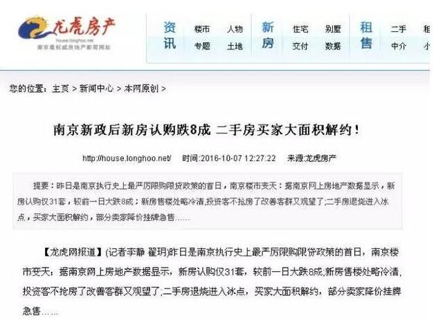 南京龍虎網也報道稱,投資客不搶房,改善客群又要開始觀望了,部分新盤的客戶流失量超過一半。在二手房市場,一些投資客聽聞限購令后,立馬已經提出了解約的要求,以前的賣方市場一夜之間轉變成買方市場,不少賣家已經提出可以降價。