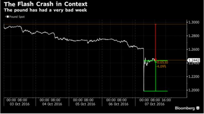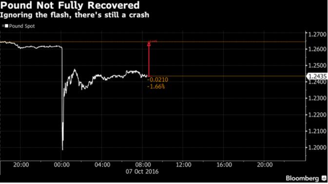 如果將英鎊隔夜動作與最近以來其他備受矚目的“閃電崩盤”事件做個比較,就會發現另外一個明顯的差別。截至倫敦當地時間上午9點,英鎊匯率尚未回升至此前的水平。