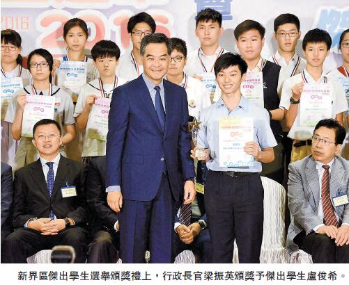 由新界青年聯會、新界青聯發展基金會及香港杰出學生會主辦的「新界區杰出學生選舉2016」頒獎典禮,昨日在沙田麗豪酒店舉行,有行政長官梁振英、中聯辦新界工作部部長劉林、中聯辦青年工作部副部長楊成偉、政協委員兼行會成員張學明、教育局副局長楊潤雄等嘉賓出席。頒獎典禮中,表揚了10位杰出學生及34位優秀學生的卓越成績,而各杰出學生所屬學校校長、老師、家長亦有出席典禮。