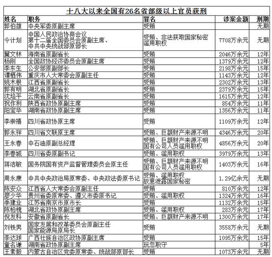 附:十八大以来省部级以上获刑官员(截至2016年9月29日)