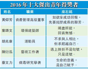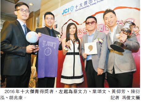 【香港商報網訊】記者潘仲男報道:十大傑出青年選舉2016昨日揭曉。今年由5人獲此殊榮,包括有「保齡神童」之稱的胡兆康、後天失明的「黑暗劇場」藝術總監陳衍泓、遠赴西非進行伊波拉病毒測試的科學家蔡文力、有份參與「零碳天地」的環保建築師葉頌文、及在過往20年服務10多個志願團體的新鴻基資產管理高級董事黃仰芳。