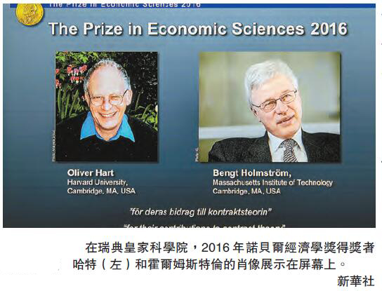 【香港商報网訊】瑞典皇家科學院10日宣布,將2016年諾貝爾經濟學獎授予哈特和霍爾姆斯特倫,以表彰他們在合約理論方面的研究貢獻。