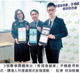 學會聯同香港營養師協會、香港中文大學醫學院矯形外科及創傷學系共同研發出新的手機應用程式「營運港健康」,使用者只須填寫身體狀況資料,包括身高及體重等,並進行掌上壓、仰?起坐等五組體能測試,程式便會制訂個人化的運動建議。程式亦內置多達50段專業體適能教練製作的運動訓練指導影片,有如網上私人體適能教練,讓使用者在家中也可輕易做運動。此外,程式內亦載有約500款本地化的食物營養資料,使用者可每天輸入所吃過的餐單,程式會計算出攝取的卡路里,讓使用者更容易了解每日攝取量。