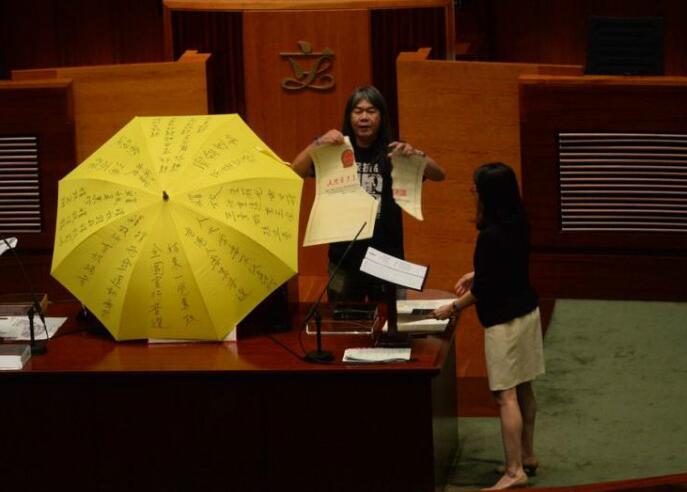 梁國雄撐黃傘宣誓就任及撕爛道具