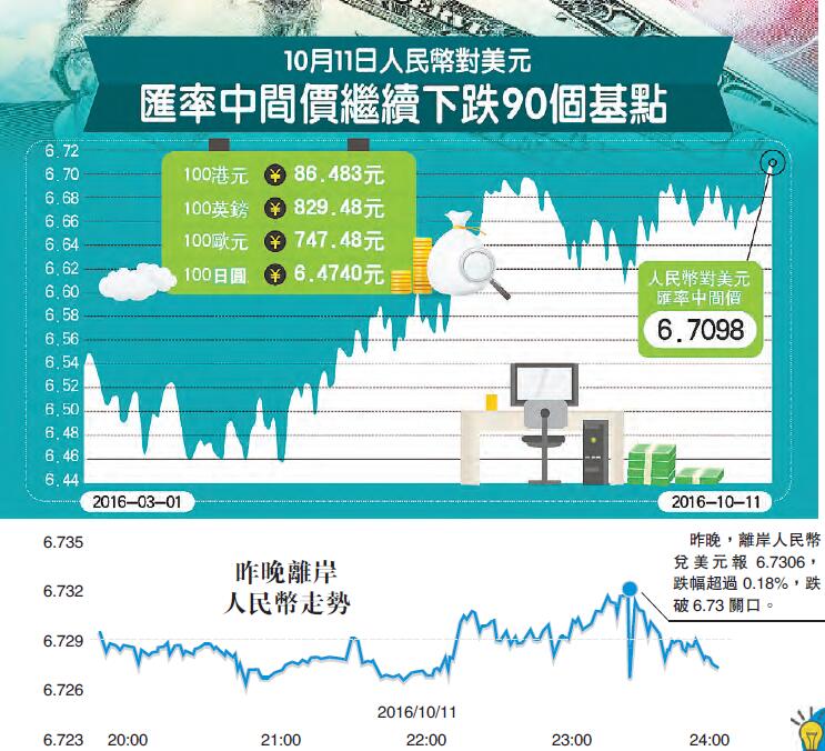 【香港商報網訊】昨日,中國外匯交易中心公布人民幣對美元中間價為6.7098,較上一交易日下調90個基點,逼近6.71。這是人民幣中間價已連續5個交易日下跌。除去國慶長假和周末兩日休息,人民幣中間價從9月27日的6.6646,持續走低至11日的6.7098,共下調452基點。