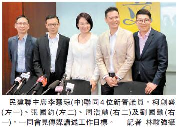 【香港商報網訊】記者林駿強報道:今屆立法會將有不少新臉孔。民建聯主席李慧瓊昨日聯同該黨4位「新丁」議員與傳媒會面,分享他們的工作目標,其中張國鈞表示會專攻教育政策,身為律師的他會與同為律師的黨友周浩鼎,聯繫其他建制派具法律背景的議員,希望日後將正確法律觀點帶入議會;柯創盛則關注房屋、交通、醫療等民生議題;劉國勳則希望擔任橋樑角色,促進內地與香港的關係、城市及鄉郊的關係、政府與地區的關係。