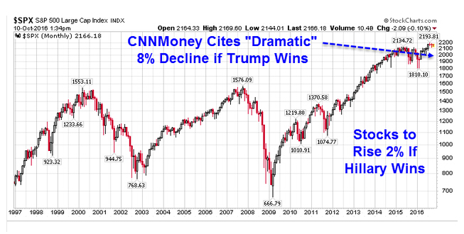 Prakken表示,市場痛恨不確定性,而特朗普的政策缺乏細節東西,令人吃驚。相反,如果希拉里當選,股市將會反彈2%,因為外界認為她的政策類似于奧巴馬。現在看來,她勝出的幾率更高一些,這將減少市場任何一個方向的波動。