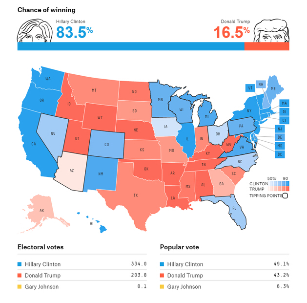 FiveThirtyEight數據顯示,希拉里有83.5%的幾率贏得大選,而特朗普僅有16.5%。