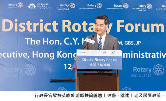 梁振英晚上在「地區扶輪論壇」向一批扶輪社會員分享對香港的一些看法。他指出,香港未來對外對內仍有很大發展空間,有良好經濟基礎,經濟穩健增長,失業率維持在較低水平,剛過去財政年度(2015/16),特區政府所收公司利得稅是歷來最高,一定程度反映香港大小企業經營狀況,從這個數據港人可以得到一定信心。