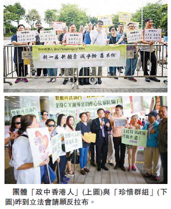 「政中香港人」約20位成員,昨早到立法會外請願,表達反「拉布」呼聲。團體召集人劉礎慊指出,上屆立法會出現的「拉布」、流會,加上議員冗長的發言,讓多項民生事項都未能完成審議並通過,令市民受害。他亦稱,立法會開會花費的是公帑,議員應該要開會,不要抱「做騷」的心態「博被趕」。
