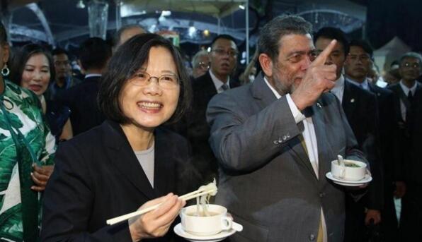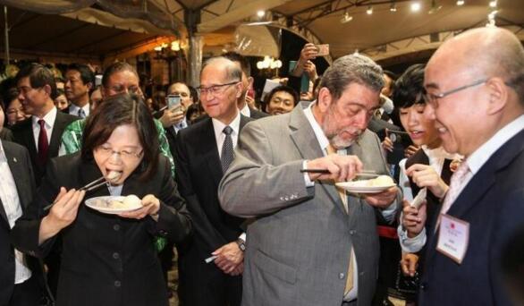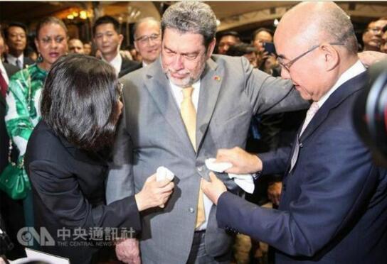 據臺媒報道,10日晚舉行“臺灣有你真好”酒會,蔡英文邀圣文森特和格林納丁斯總理岡薩爾維斯等,岡薩爾維斯品嘗小籠包時不小心弄臟了西裝,蔡英文上前幫忙擦拭。