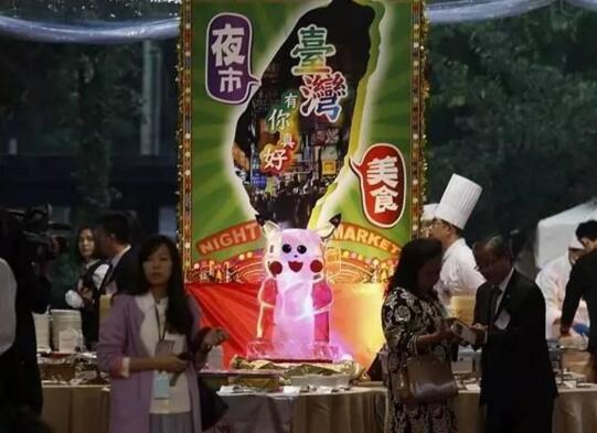 “皮卡丘”冰雕還不算是十足的槽點,重點是后面那個印有“臺灣有你真好”字樣的臺灣夜市美食大型宣傳板……