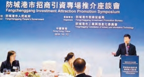 防城港市市長何朝建致辭說,防城港市地處華南經濟圈、西南經濟圈與東盟經濟圈的結合部,既沿海又沿邊,是中國內陸腹地進入東盟最便捷的主門戶、大通道和橋頭堡。作為中國「一帶一路」重要節點城市之一,它既是中國唯一與東盟海陸相連的門戶城市,又是中國西部唯一一個擁有億噸大港的樞紐城市,還是一座美麗的全海景生態海灣城市。隨着改革開放步伐不斷加快,香港中電、香港中華煤氣、香港華潤、香港郭氏集團等一批香港知名企業投資落戶防城港,總投資超百億元人民幣。隨着該市「十三五」規劃的實施,防城港市將全力打造廣西「兩個建成」先行區,即率先在廣西全面建成小康社會,率先建成中央賦予廣西「國際大通道、戰略支點、重要門戶」三大定位的重要節點。