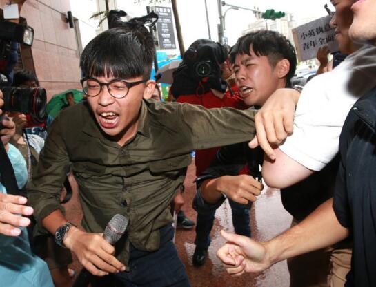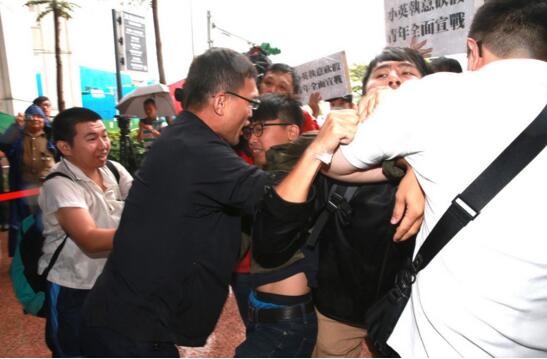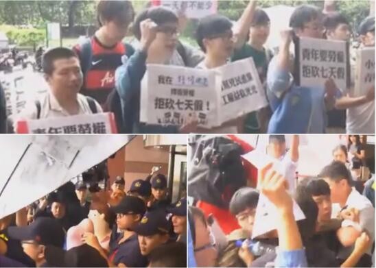 樓上開會,樓下抗議!臺灣地區領導人蔡英文12日在民進黨黨部開中常會,樓下青年團體手持標語抗議,痛批新政府嘴上說要和青年站在一起,現在卻大砍7天假,說一套做一套。民進黨也派出青年主任黃手達接見,但“跳針式”(閩南語,表示詞窮,不斷重復一句話——觀察者網注)的答復卻惹怒眾人,現場爆發推擠沖突。青年團體表示不排除在10月23日于“立法院”發動更大抗爭。