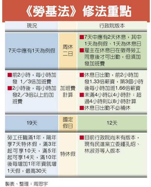 臺灣“勞基法修正草案”鬧得沸沸揚揚,草案內容將現行“一周一例假日”,修正為“一周兩例假日”。“一例一休”與“周休二例”的差別,到底是什么呢?臺當局“行政院”版本的“一例一休”跟“立院委員會”版本的“周休二例”差別在哪?