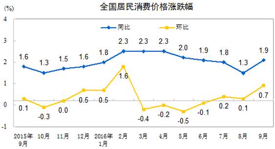 9月份,全國居民消費價格總水平環比上漲0.7%。其中,城市上漲0.7%,農村上漲0.7%;食品價格上漲1.7%,非食品價格上漲0.4%;消費品價格上漲0.8%,服務價格上漲0.5%。