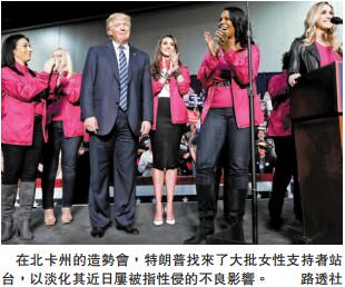 《紐約時報》12日率先曝光了兩名女性對特朗普的公開指證,稱其分別於1980年左右和2006年曾對她們行為不軌。此后,多家美媒相繼報道了類似內容,目前至少6名女性都公開指證曾遭遇特朗普「鹹豬手」。對此,特朗普日前在佛州棕櫚灘一場競選活動上強調,這些女性都是「糟糕的說謊者」。