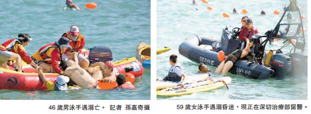 第6届「维港渡海泳」昨晨在九龙鲤鱼门三家村公众码头举行,终点设於憃鱼涌公园,参赛者於早上8时半起分批起步,至昨晨9时半左右,「优悠组」一名女泳手突被发现在终点对开约10多米海面遇溺,由救生员拉上救生艇,被救起时失去知觉;岂料相隔仅约15分钟,同组再有另一名男泳手亦於终点前300米被发现遇溺昏迷,同样要由多名救生员救上橡皮艇并即时急救,两人被送抵东区医院后,男泳手最终证实不治,死者家属惊闻噩耗后赶到医院认尸,悲痛不已。