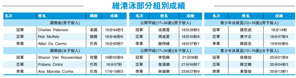 曾参与里约奥运会的香港泳队成员欧铠淳指,海上有暗涌及水流,而且水流比想像中急,在中段感到吃力。参加了「优悠组」的方先生及陈小姐指,海上水流湍急,而赛道上头尾和尾段十分挤拥,更被其他参赛者踢到,他们认为应分批让参赛者下水。
