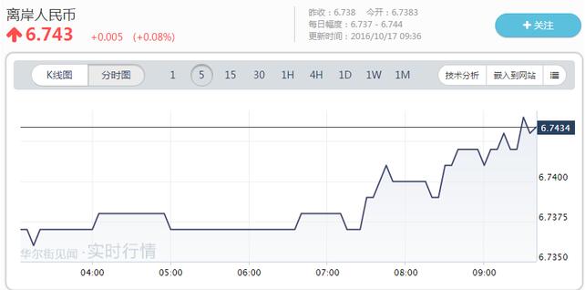 即期方面,在岸人民幣開盤跌破6.73,目前報6.7331。離岸人民幣跌破6.74。