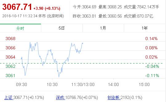 截止午盤,滬指報3067.71點,漲3.90點,漲幅0.13%,深成指報10766.76點,漲7.08點,漲幅0.07%,創業板報2192.00點,跌2.23點,跌幅0.10%。