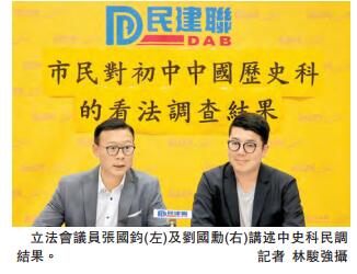 民建联立法会议员刘国勋及张国钧昨日召开记者会,表示为了解市民对中国历史科的看法,民建联本月上旬成功访问530名市民,发现当中69.1%受访者认为初中学生的中国历史知识不足够,高达75.6%访者赞成在初中阶段加强中国历史教育,另有65.4%赞成初中中国历史课程要独立成科。