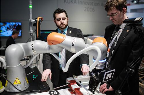 資料圖:工作人員在德國庫卡機器人公司展區展示機器人手臂。 新華社