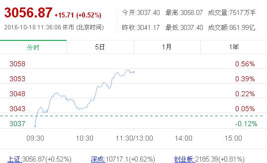 截止午盤,滬指報3056.87點,漲0.52%,創業板漲0.81%。