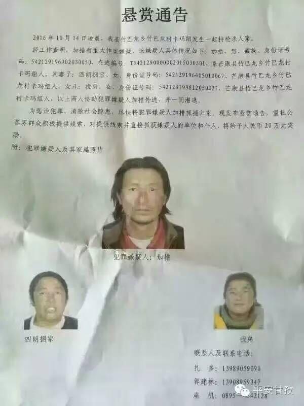 10月18日,甘孜藏族自治州公安局通過官方認證微信“平安甘孜”發布的通緝令顯示,經工作查明,加措有重大作案嫌疑。加措生于1969年2月3日,芒康縣竹巴龍鄉竹巴龍村卡瑪組人,在逃編號為“T5421290000002015030301”。其妻子四朗擁宗和女兒找弟協助犯罪嫌疑人加措外逃,并一同潛逃。