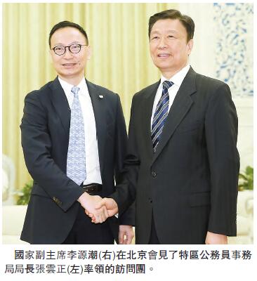 【香港商報網訊】記者周偉立報道:國家副主席李源潮昨早在北京人民大會堂接見到訪的香港公務員訪問團,包括公務員事務局局長張雲正、8位常任秘書長和3位部門首長。李源潮表示,香港公務員是貫徹落實「一國兩制」和《基本法》的重要力量。他讚揚行政長官梁振英率領特區政府,在土地、房屋、扶貧、養老等問題上,政策舉措已取得積極成效,希望他們再接再厲,在特區首長的帶領下,依法有效施政。
