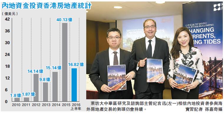 香港市場方面,報告指,內地投資者上半年在香港地產市場投資約16.82億美元,雖然相比去年同期少約9%,但7月至10月,香港地產市場已錄得數宗買家為中資的大額成交,涉資高達13.01億美元,令中資今年在港投資額累增至29.83億美元。