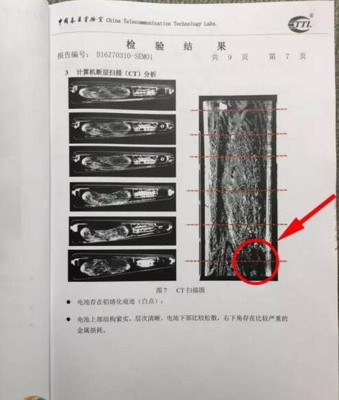 中國泰爾實驗室環境與安全部主任巫彤寧告訴記者,他們的專家小組對這次兩位消費者送檢的手機進行仔細分析后發現,這臺來自遼寧消費者張思童的三星Note7手機因燒損嚴重,無法推定起火原因。而這臺來自廣州消費者回仁杰的三星Note 7手機,在外觀上“未發現外部加熱引起熱損毀的痕跡”,又通過X射線成像及計算機斷層掃描對電池進行內部結構分析,“發現電池右下角缺失明顯,邊際模糊。電池內部存在鋁熔化的痕跡。”