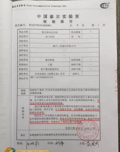 工信部下屬的中國泰爾實驗室正式向央視《消費主張》欄目提供了中國第一例由消費者送檢的三星國行版Note 7燃損手機的檢測報告。