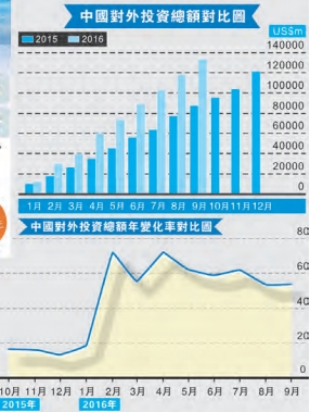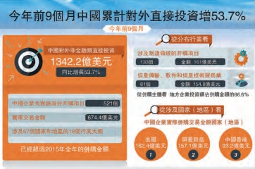商務部的數據顯示,今年前9個月,中國境內投資者共對全球160個國家和地區的6535家境外企業進行了非金融類直接投資,累計對外直接投資8827.8億元人民幣(折合1342.2億美元),同比增長53.7%。這一增幅相對於今年早些時候出現的幾個峰值低了約五分之一,但仍遠高於2015年最后幾個月的水平。另據悉,今年9月,中國對外投資總額為162億美元,同比增長56.9%,環比增長5.6%。