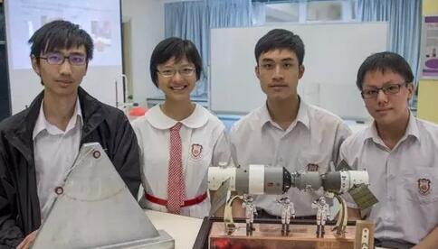 在香港保良局罗氏基金中学,参与研究的同学与天宫二号模型及“双摆实验”模型合影