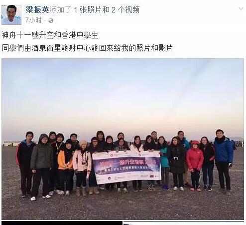 今天一早,随着“神舟十一号”成功发射,香港特首梁振英在第一时间发表Facebook表示:“神舟十一号刚顺利升空,香港市民都为国家航天事业又跨进一大步而感骄傲。”