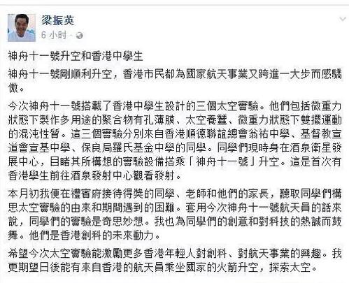 梁振英写道:今次神舟十一号搭载了香港中学生设计的三个太空实验。它们包括微重力状态下制作多用途的聚合物有孔薄膜、太空养蚕、微重力状态下双摆运动的混沌性质。这三个实验分别来自香港顺德联谊总会翁佑中学、基督教宣道会宣基中学、保良局罗氏基金中学的同学。同学们现时身在酒泉卫星发展中心,目睹其所构想的实验设备搭乘“神舟十一号”升空。这是首次有香港学生前往酒泉发射中心观看发射。