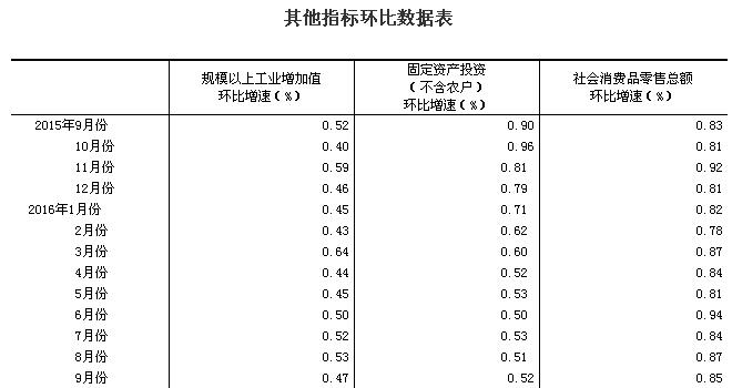 (2)根據季節調整模型自動修正結果,對近一年來各期國內生產總值、規模以上工業增加值、固定資產投資(不含農戶)、社會消費品零售總額環比增速進行修訂。修訂結果及2016年三季度GDP環比數據、2016年9月份其他指標環比數據如下: