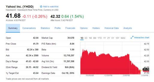 雅虎周二在納斯達克交易所的開盤價為42.04美元。截至周二收盤,雅虎股價下跌0.11美元,收報于41.68美元,跌幅為0.26%。截至美國東部時間周二17:42分(北京時間周三早5:42分),雅虎股價在盤后交易中上漲0.64美元至42.32美元,漲幅為1.54%。過去52周,雅虎股價最高為44.92美元,最低為26.15美元。