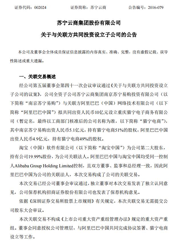 蘇寧云商表示,與阿里的戰略合作逐步深入,雙方在保持業務獨立性的基礎上協同各自在用戶、平臺、商品、服務、技術等方面的資源,服務消費者、激能品牌商、賦能中小零售商,創新變革零售行業。為更加有效地利用雙方資源,公司子公司與阿里中國共同投資設立貓寧電商。