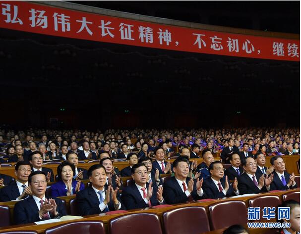新華社北京10月19日電(記者霍小光、吳晶)千山萬水,譜寫壯麗史詩;不忘初心,踏上新的征程。紀念紅軍長征勝利80周年文藝晚會《永遠的長征》19日晚在北京人民大會堂舉行。黨和國家領導人習近平、李克強、張德江、俞正聲、劉云山、王岐山、張高麗等,與首都3000多名群眾一起觀看演出,共同回望那段光輝歲月。