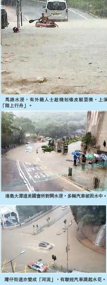 暴雨肆虐之下,港岛南区及柴湾区更成为重灾区,大潭笃水塘水坝上的大潭道一度变成河川,水深及膝,人车均无法通过,另於浪琴园对开一段大潭道有多辆汽车死火困水中,又有外籍人士苦中作乐,竟在水浸的大潭道马路中划橡皮艇耍乐,出现「陆上行舟」奇景。此外,香岛道、浅水湾道及南湾道来回方向多处亦出现积水,当局宣布附近一带道路全线封闭,受影响巴士路线须改道行驶。