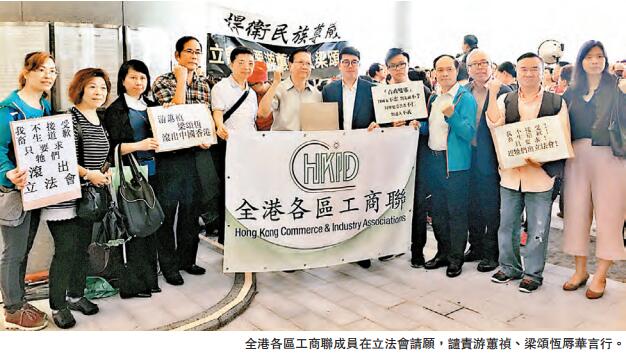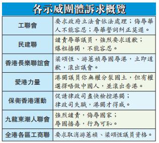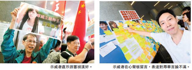 示威团体包括香港长乐联谊会、保卫香港运动、九龙东潮人联会、爱港力量、全港各区工商联等。各团体均带备道具,高喊口号,挥舞国旗;更有示威者对游、梁两人画像予以践踏,以表示对两人的不满,当中一名女士口中念念有词,批评游、梁侮辱国家,不配做中国人。