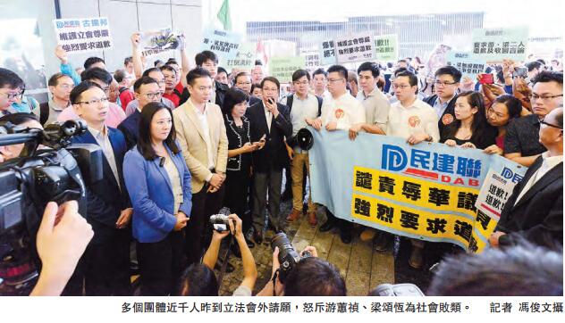 【香港商报网讯】记者冯炜强报道:游蕙祯和梁颂恒仍然没有为宣誓时辱华言论道歉,昨日冒着风雨到立法会的近千名示威者,毫不留情地痛斥两人「社会败类,滚出议会!」并要求其为辱华言论向全球华人道歉,及停止所有辱华言论。对於立法会大会以流会告终,游、梁两人未能宣誓,示威者欢呼叫好。工联会黄国健表示,面对辱华大是大非,流会是无计可施的做法,同时这亦是回应市民的诉求。