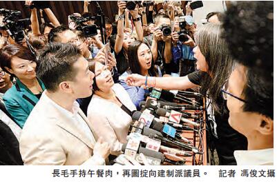 【香港商报网讯】记者戴合声、何加祺报道:建制派议员昨日以离席行动抗议青年新政议员宣誓后,於会议厅外一起见记者,社民连议员梁国雄(长毛)突然出现捣乱,竟向建制派议员掟午餐肉,场面即陷入混乱。其中体育、演艺、文化及出版界议员马逢国被掷中头额,马强烈谴责梁国雄,指对方不负责任,声言会保留追究权利。