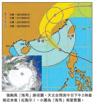 隨着「海馬」迫近,天文台昨晨8時20分發出1號戒備信號,並於晚上8時40分改發3號強風信號。天文台表示,按照現時預測路徑,「海馬」會在今日靠近廣東沿岸,並在下午至黃昏最接近本港,可能在100公里內掠過,屆時本港天氣會顯著轉壞,有頻密狂風及大雨,海面有大浪及湧浪,低窪地區可能出現水浸,雨勢要到明日才會減弱。