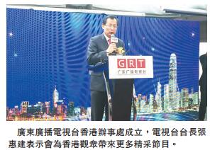 【香港商报网讯】记者冯炜强报道:广东广播电视台香港办事处正式在香港成立,台长张惠建表示,将秉承「促进三地紧密合作,携手发展前行」的理念,不断增进粤港澳相互间的资讯沟通、文化交流、社会交往和经济繁荣,促进粤港澳三地财经资讯、文化娱乐内容的生产及传播,将更多精采的粤语电视和广播节目带给香港的观众,促进粤港澳资讯零距离的无缝连接。