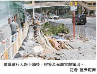 此外,环翠道兴华一邨商场对开一段行人路,约20米乘3米路面下塌,沙泥被水冲走,有喉管及光纤电缆均露出,路旁4棵树摇摇欲坠,工人锯断4棵树,路政署已将路面封闭,等待工人重铺。街坊指担心今日强台风「海马」袭港时,破坏情况更加严重。
